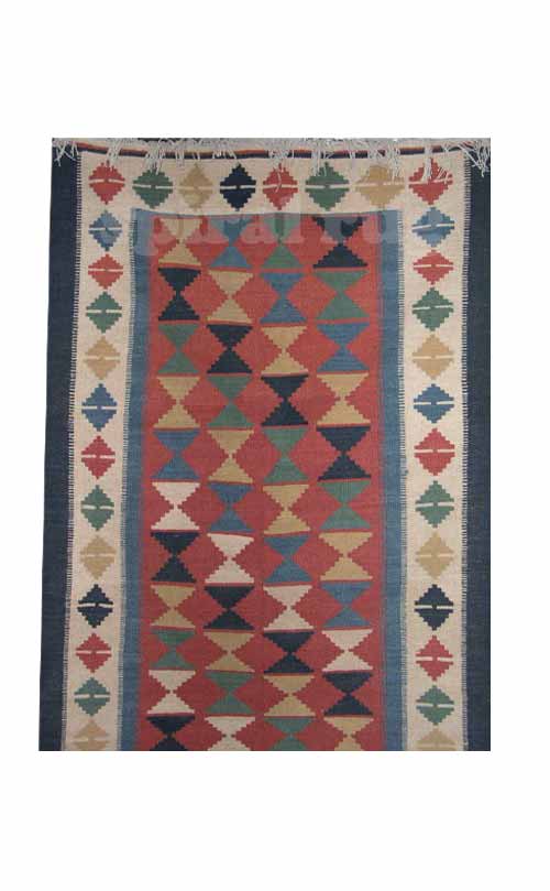 گلیم دستباف با طرحهای لوزی و رنگهای قرمز، سفید و آبی، هنری باستانی است که نمایانگر هویت و سنت است. این ترکیب رنگها و طرحها زیبایی خاصی دارد.